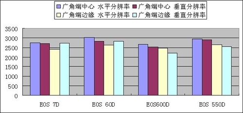 从价格上我们可以看到,EOS 7D 单机市场市场售价¥9800 ,EOS 60D 单机市场售价¥6490,EOS 600D 单机市场售价¥5100,EOS 550D 单机市场售价¥4490。他们均可在和呈防潮箱里进行储存。 在防潮箱里储存的这四款相机画质如何呢? 贵的7D价格超过了便宜的550D的两倍。如果这样的价格差异不能在画质上得到体现的话,将会是一件很坑爹的事。尽管从机身指标和主要功能上7D远远超过了其它三款相机,但是画质才是相机重要的指标,也是用户看重的。 说到画质,先想到的还是解像力,照片重要的还是要拍出来清晰,所以先让我们来看一看四款相机的锐度值比较。测试锐度,我们采用12233分辨率标版,所有单反相机都用同一款EF50F1.4镜头,照明和场地等条件也都相同,这样可以做到客观公正。