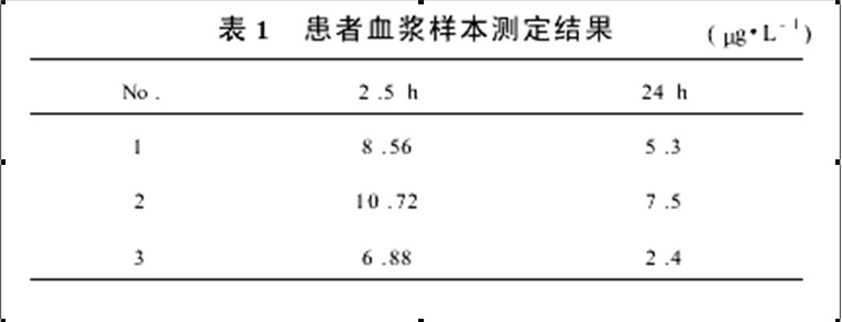 2.4标准曲线的绘制 取空白血浆7份,每份1mL,各加入100μL内标液,分别加入适量标准溶液使之配成5、10、20、40、60、100、120μg?L-1的标准系列;按2.2项下操作测定,由色谱工作站直接求出CL对内标的峰面积比值(Y)与相应的浓度比值(X)的回归方程,Y=0.753X+0.011,r=0.9993。检出限为0.015μg?L-1(rSN=3),线性范围为1.5~120μg?L-1。 2.5回收率和精密度的测定 对高、中、低3份CL含量为5、20、40μg?L-1的标准血样分别按本法检测,其回收率分别为90.5%、94.7%、96.3%,平均为93.8%。同时3份样本按本法分别平行检测5次,RSD分别为2.6%、3.7%、4.2%。 2.6样品测定 我们采用该方法测定了3例患者口服CL后的血药浓度,患者每次口服该药30μg,服药后2.5h和24h静脉取血。结果见表1。