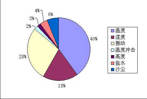 环境应力条件可以引起产品失效,Hughes航空公司(美国)技术资料明确地表示了失效与环境应力之关(见图2)。可见在各种应力影响之中温度和湿度环境应力所引发地失效占所有环境应力引发失效的60%左右,而温度应力与失效之间存在着密切的关系。